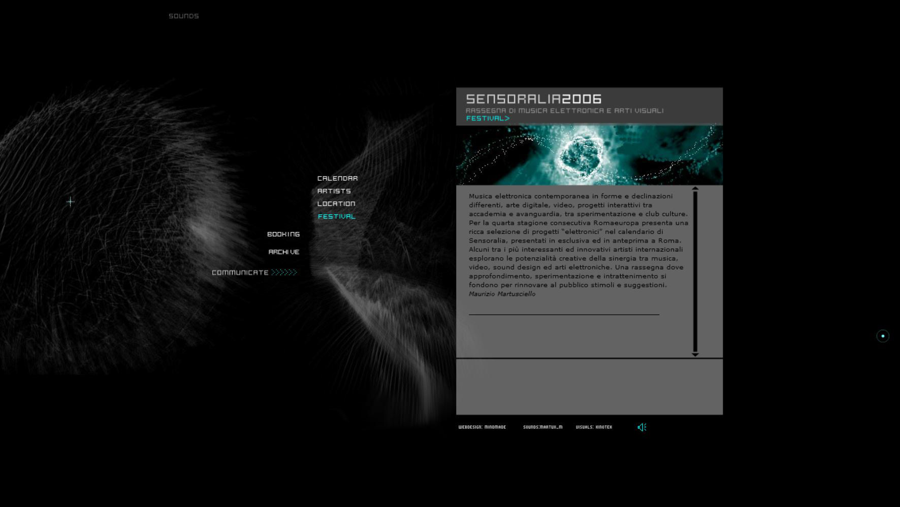 Sensoralia, Electronic Music and arts Festival in Rome, Italy commissioned me to design and develop their branding and website for the 2006 edition. I was provided with some of the visuals and music that were going to be presented. I created a visually engaging, fully animated interactive experience to present the relevant information to be clear and easily accessible, and give a sense of the Festival's offerings. The website was received with great enthusiasm, both from the organizers and the artists showcased.